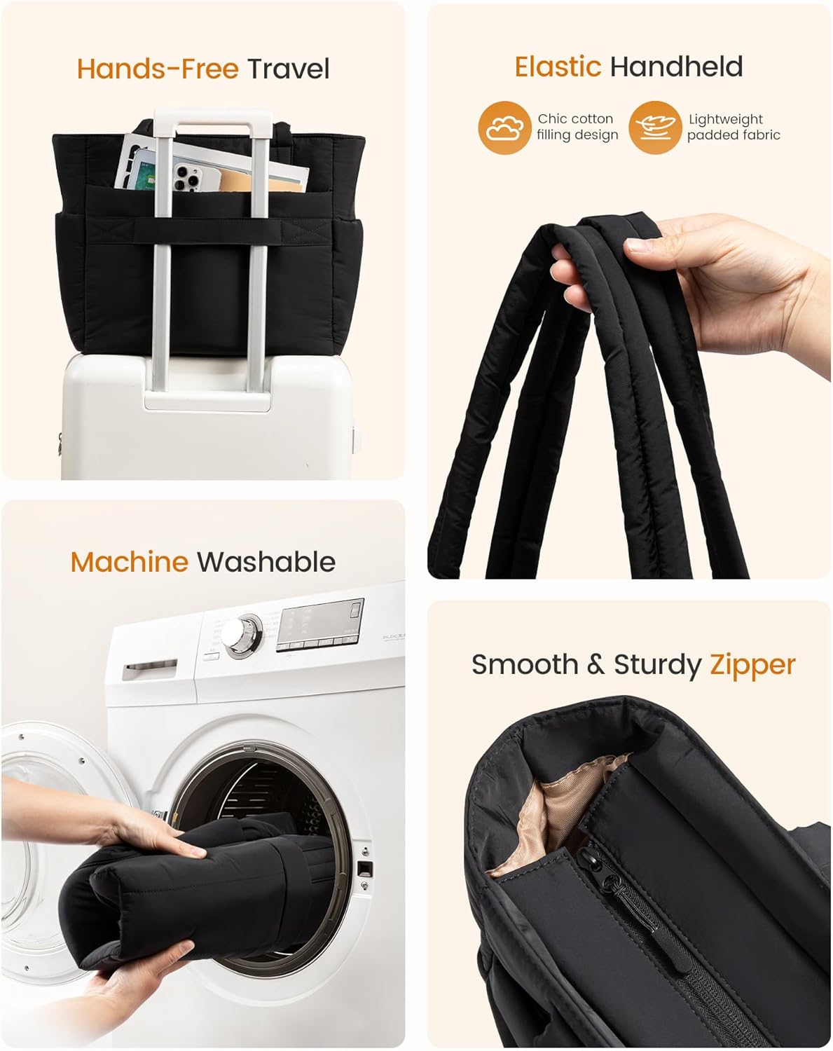 - 【Travel-Friendly & Machine Washable】This women’s puffer tote features extra-wide, comfortable handles for effortless carrying by hand or over the shoulder. The rear luggage strap allows attachment to suitcase handles, enhancing travel convenience. Fully machine washable and foldable, its high-stretch fabric retains its shape even after repeated washing.